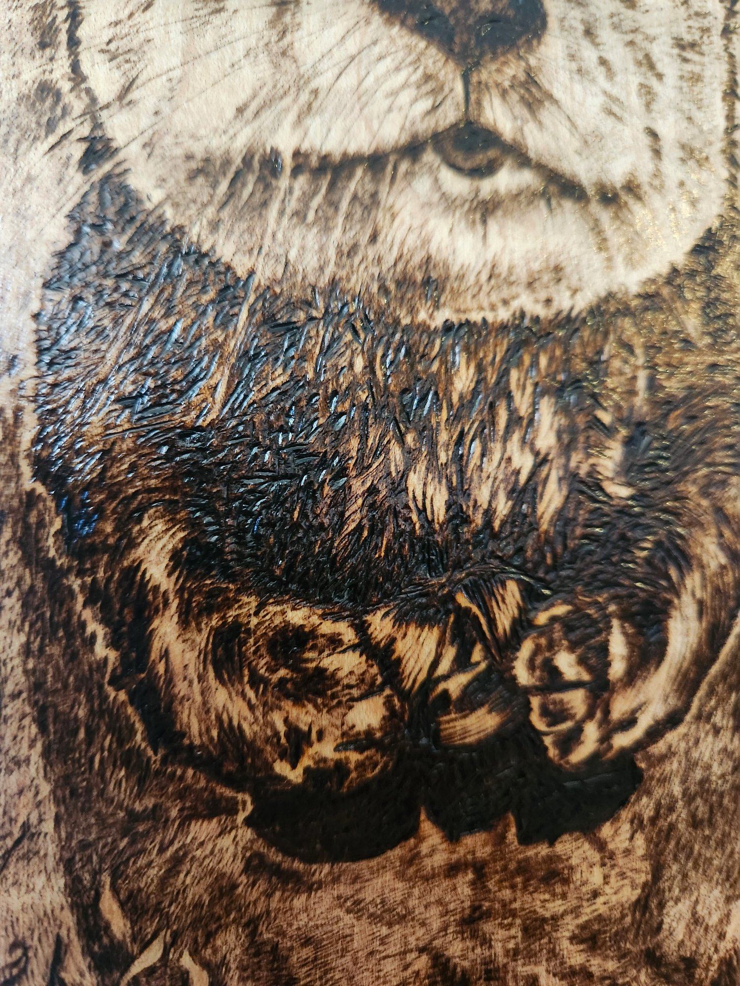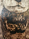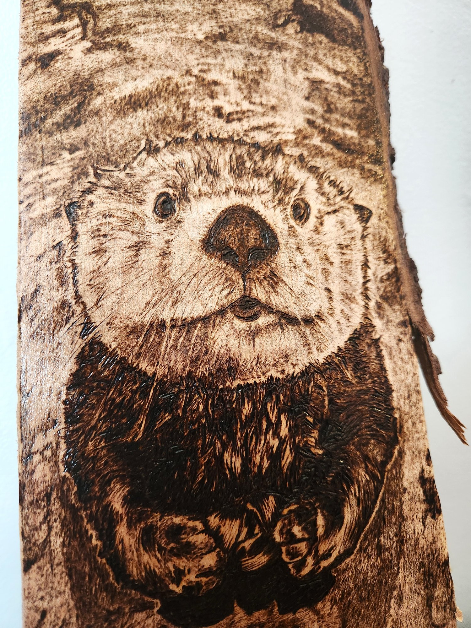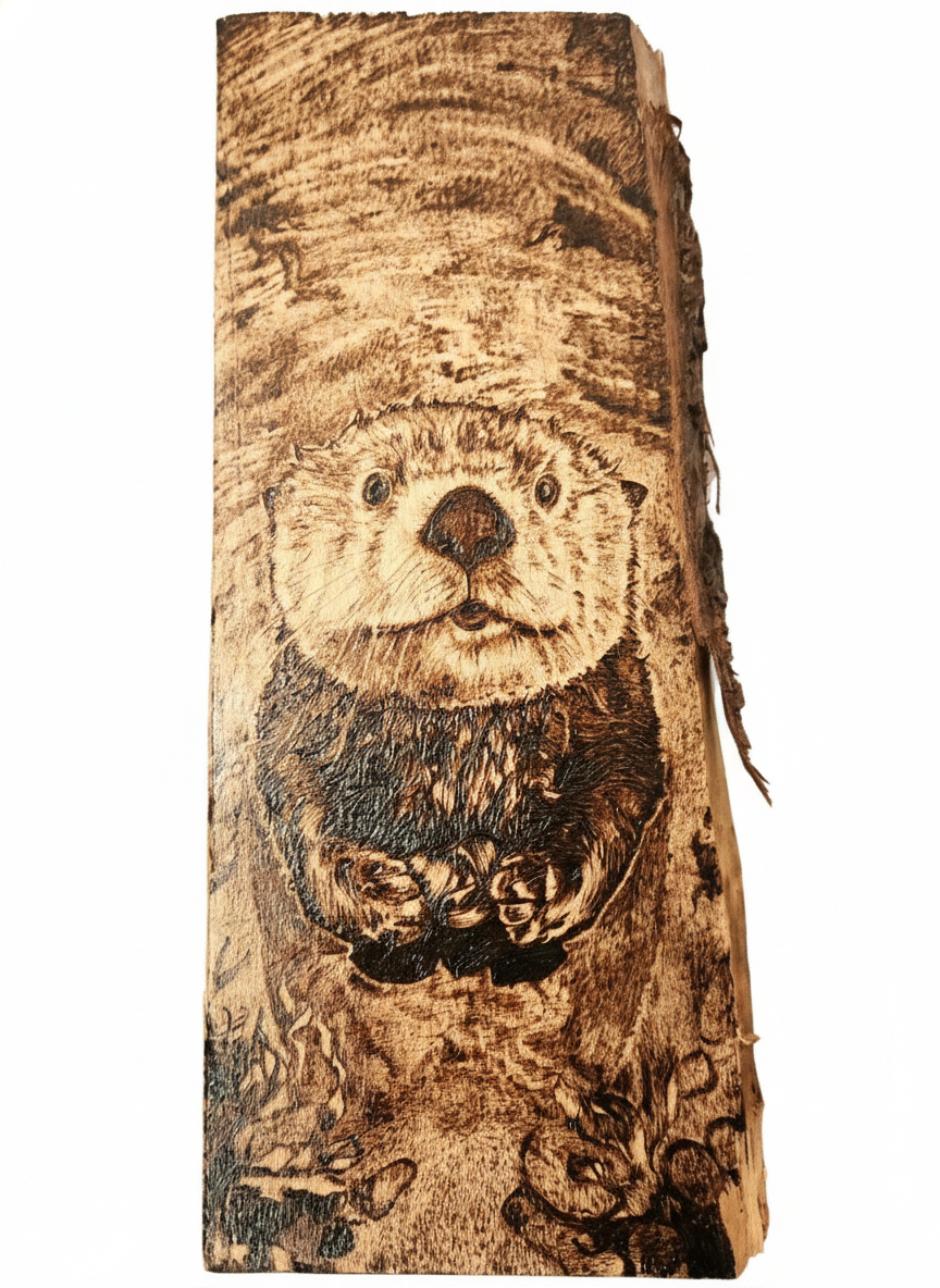 This pyrography piece is burned on live edge maple and sealed for durability. It is 11"x 5". The otter may be the most adorable creature in the ocean and he happily holds his shells while floating in the water.